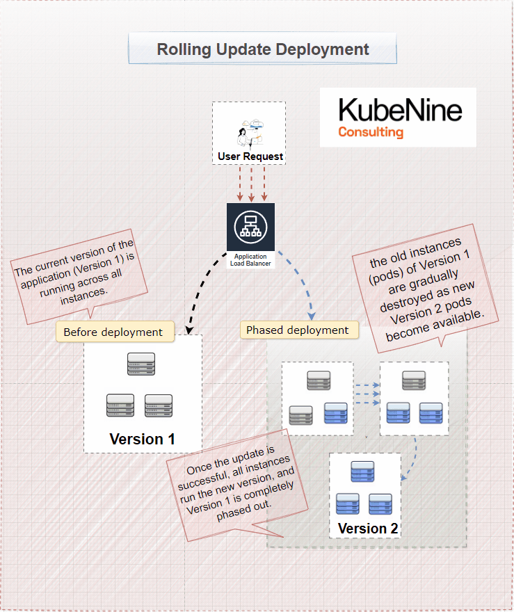 - Gradual Replacement: Kubernetes replaces old pods with new ones incrementally.