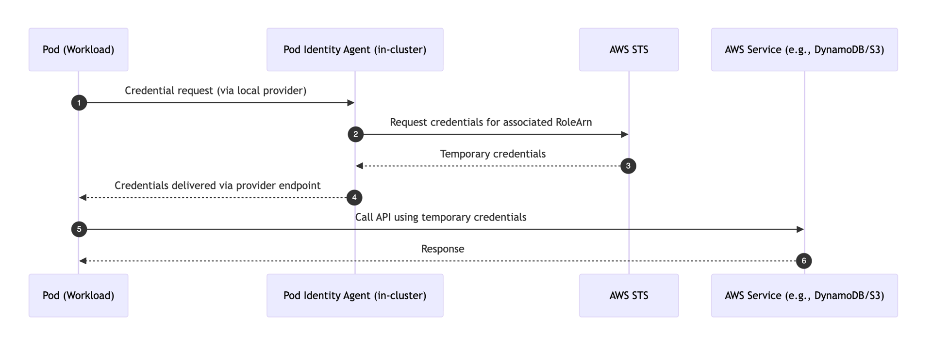 That node-local agent serves credential requests for matching pods and talks to AWS STS and AWS APIs to fetch short-lived credentials. This is how pods get credentials without you wiring up an OIDC provider or adding role annotations.