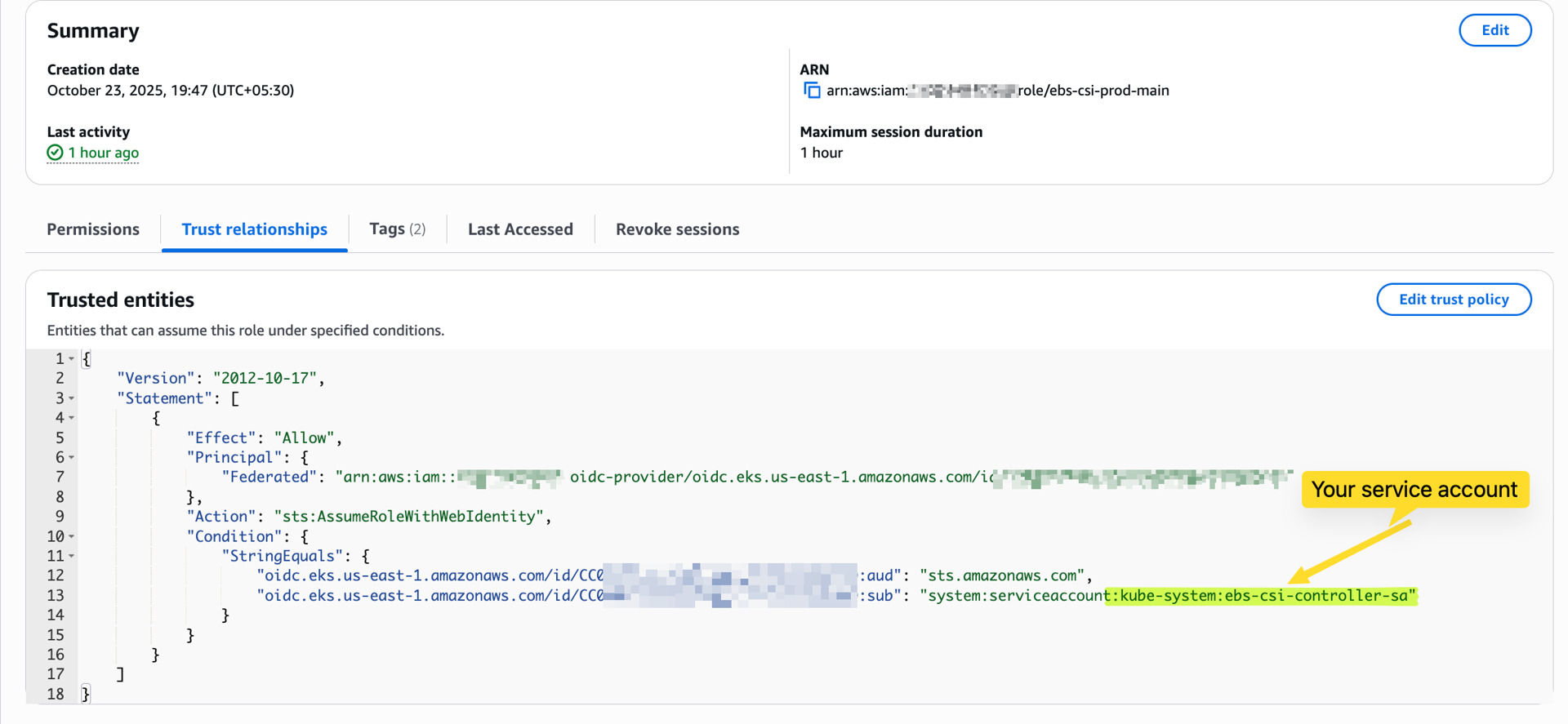 - That service account is tied to an IAM role (directly via IRSA or via an association with Pod Identity).