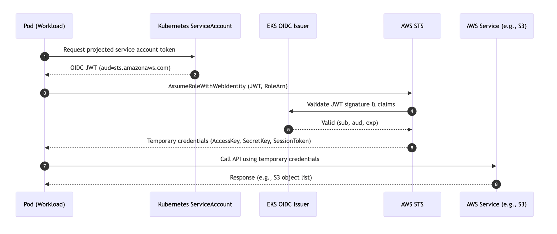 sub) and audience (aud). - STS returns short-lived credentials, which the pod uses for AWS API calls.
