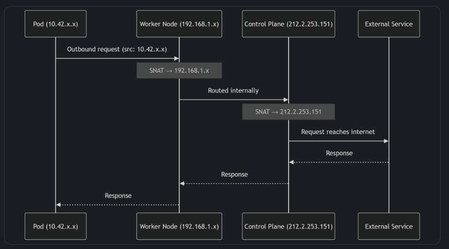 192.168.1.x) - All outbound pod traffic is routed through the control plane