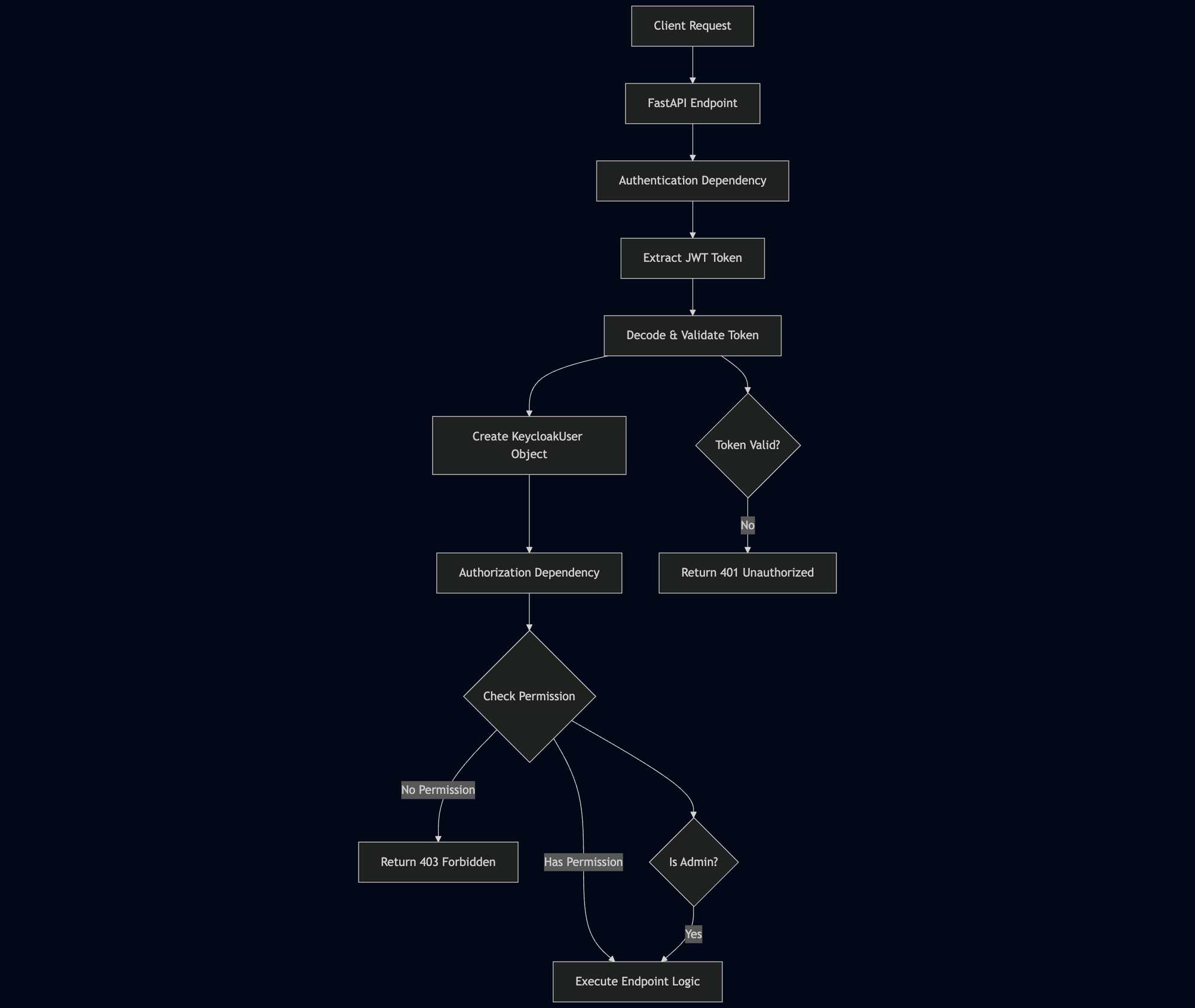 The system handles authentication, permission checking, and resource-based access control while maintaining code clarity. FastAPI's dependency system makes it easy to add authorization to new endpoints without duplicating logic.