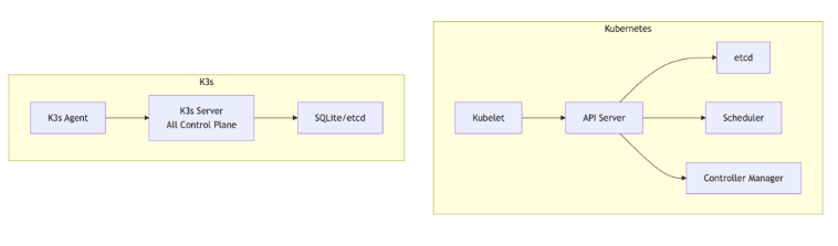 Standard K8s demands substantial resources: at least 2 CPU cores and 4GB RAM per node. K3s runs efficiently on 1 CPU core and 512MB RAM.