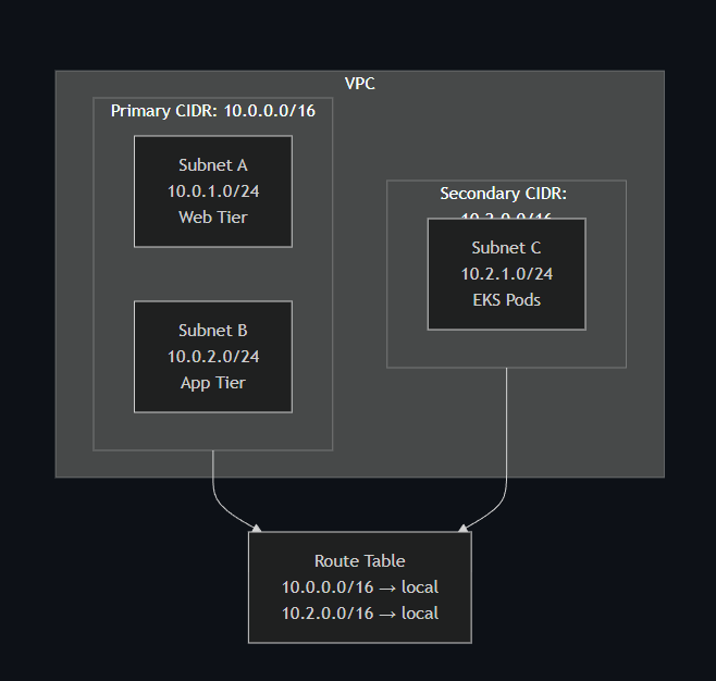 One thing that trips people up: existing subnets can't be resized or moved. If you've run out of IPs in a subnet, you can't expand it. You'll need to create a new, larger subnet in your secondary CIDR and migrate workloads over.