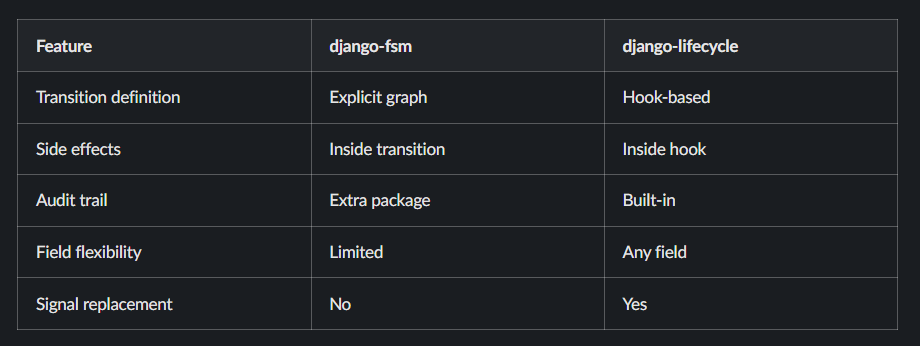 Using django-lifecycle hooks, you can implement a clean and maintainable state machine directly at the model level. This approach keeps your logic simple, avoids unnecessary dependencies, and scales well with real-world backend systems.